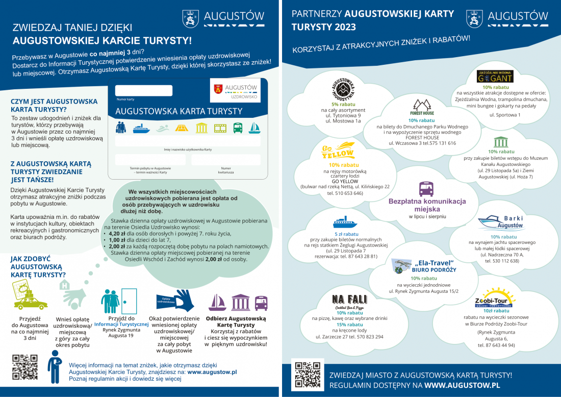 Dzięki Augustowskiej Karcie Turysty można taniej skorzystać z usług rejsowych, gastronomicznych, kulturalnych, sportowych, turystycznych i rekreacyjnych. Odebrać ją można w Centrum Informacji Turystycznej przy Rynku Zygmunta Augusta 19 i w pełni korzystać z miejscowych atrakcji.